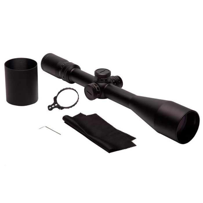Прицел поставляется с откидными защитными крышками, солнцезащитной блендой, а также поворотным рычагом для регулировки увеличения.