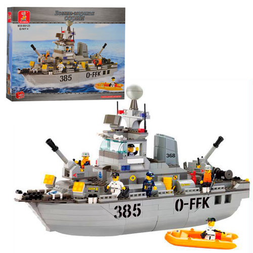 С помощью 461 элемента конструктора ребенок сможет собрать шикарный Военный корабль. Детали конструктора яркие пластиковые.