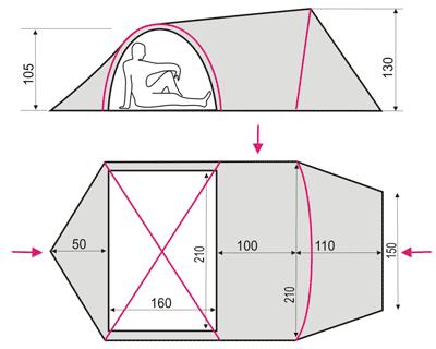Уникальная палатка с наружным размещением несущих дуг. Огромный передний тамбур может вместить велосипеды и снаряжение, а в спальном помещении с комфортом устроятся 3 человека. Второй отдельный вход с тамбуром позволяет без проблем входить и выходить из спальногго помещения. Палатка может использоваться без спального подвешенного спального помещения как базовая столовая, склад или общественная палатка. Простая установка и сборка.