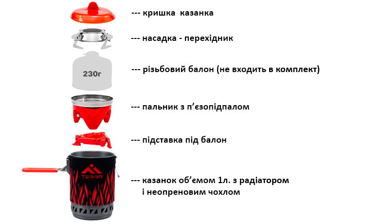 Компактна система для приготування їжі. Має автономну систему п’єзопідпалу, що дозволяє миттєво розпалити вогонь. За рахунок своєї конструкції система має високу теплову потужність, економить до 30% палива та зменшує час закипання води. Може використовуватись як система приготування із спеціальним казанком з радіатором в неопреновому чохлі та кришкою, а також за рахунок насадки-перехідника як звичайний пальник. Ідеальна для складного трекінгу та альпінізму. Компактно упаковується, комплектується м'яким сітчастим чохлом для транспортування та зберігання. Для системи приготування їжі треба використовувати різьбові балони. Також за допомогою перехідника-адаптера Adapter tube можна використовувати цангові балони.