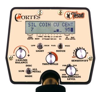 Наиболее совершенный из TESORO металлоискатель TESORO Cortes сочетает привычную настройку с помощью традиционных регуляторов с цифровой индикацией результатов поиска на ЖК-дисплее. На дисплей выводится категория обнаруженного объекта (всего 4 категории), диаграмма объектов из 9 позиций, индекс объекта (от 0 до 95), глубина залегания и индикатор разряда батареи. Наличие схемы notch-дискриминации позволяет сделать карту дискриминации 4-х диапазонной, что существенно облегчает поиск никелевых и золотых объектов на фоне алюминиевого мусора. Прибор имеет ручную балансировку грунта и подсветку экрана.