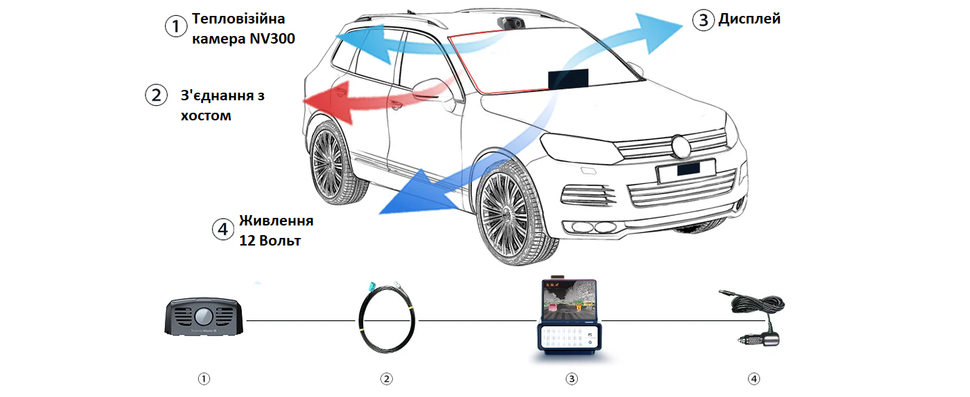 Зовнішній інфрачервоний тепловізійний модуль оснащений магнітною основою та двостороннім скотчем для встановлення в центрі даху автомобіля. Переконайтеся, що з'єднувальний кабель проходить уздовж краю вікна автомобіля в салон, і що передній огляд камери не перекритий.