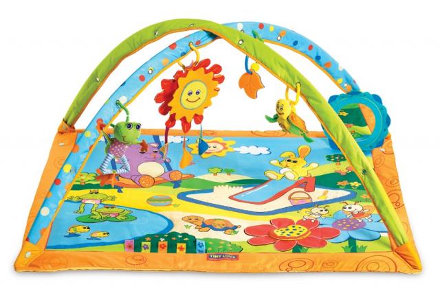 Яркий коврик с четырьмя игрушками, безопасным зеркалом и забавным солнышком с тремя мелодиями. Музыкальное солнышко реагирует на прикосновения ребёнка. Традиционная конструкция - мягкий квадратный коврик, перекрещивающиеся дуги с подвесными игрушками.
