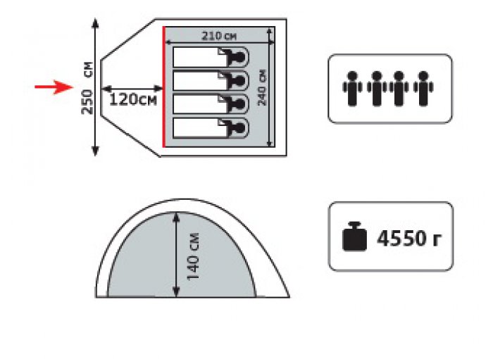 Материал тента: 100% полиэстер Taffeta 75D / 190T PU 2000 мм в. ст.