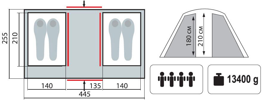 - Внутр. палатка: 100% дышащий полиэстер