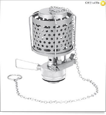 Легкая и компактная газовая лампа с металлическим плафоном, благодаря которому может не только освещать, но и обогревать. Имеет пьезоподжиг. Предназначена для использования с резьбовым баллоном