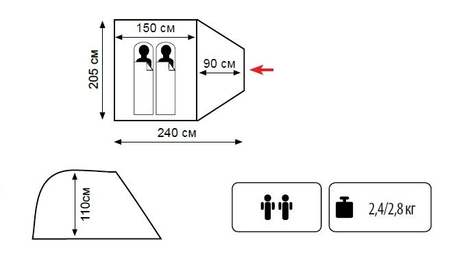 Тент: 100% полиестер 75D/190T WR PU 4000 мм. в. ст.