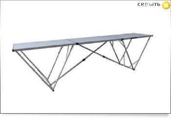 Размеры стола(д*ш*в): 298*60*78 см Размеры стола в сложеном виде (д*ш*в): 100*60*10 см Материалы стола: Алюминий, МДФ 4,2 мм Диаметр алюминиевой трубы: 22 мм Вес: 10,3 кг