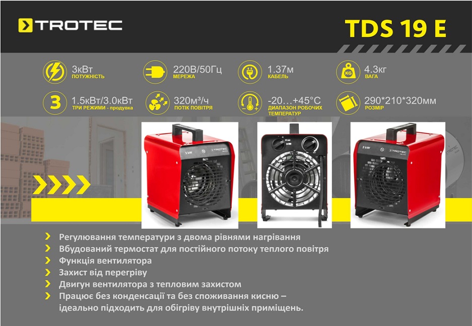 Будьте первым! Поставьте оценку, оставьте отзыв о товаре Электрическая тепловая пушка Trotec TDS 19 E: