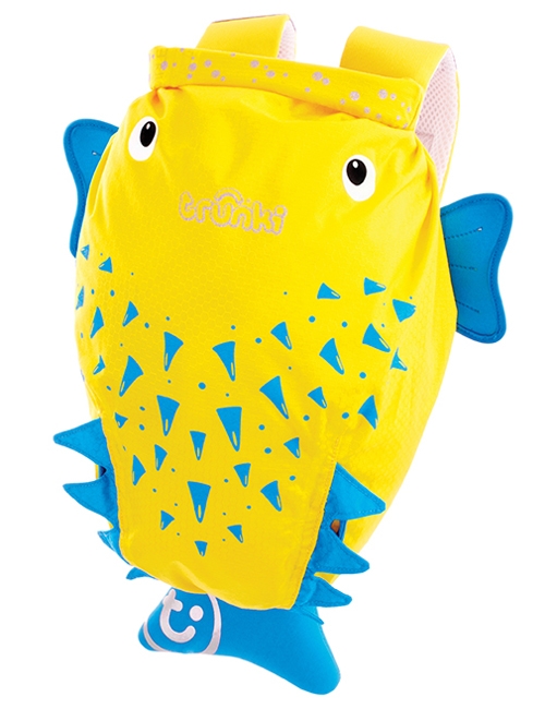 Trunki PaddlePak - это замечательный многофункциональный рюкзак для поездок на пляж, бассейн и просто для путешествий. Рюкзак сделан из легкого и прочного водонепроницаемого материала, горловина рюкзака широкая и имеет уникальное крепление-застежку top-roll, что обеспечивает водонепроницаемое уплотнение, которое защитит своего маленького владельца и окружающих от утечек влаги (например, от мокрого пляжного полотенца, купальных и плавательных принадлежностей, пляжных тапочек и прочих предметов). Рюкзак сделан в форме рыбы, в хвосте которой находится влагонепроницаемый «сухой» карман для хранения документов, абонемента в бассейн, маленького плеера ipod, проездного билета и т.д.