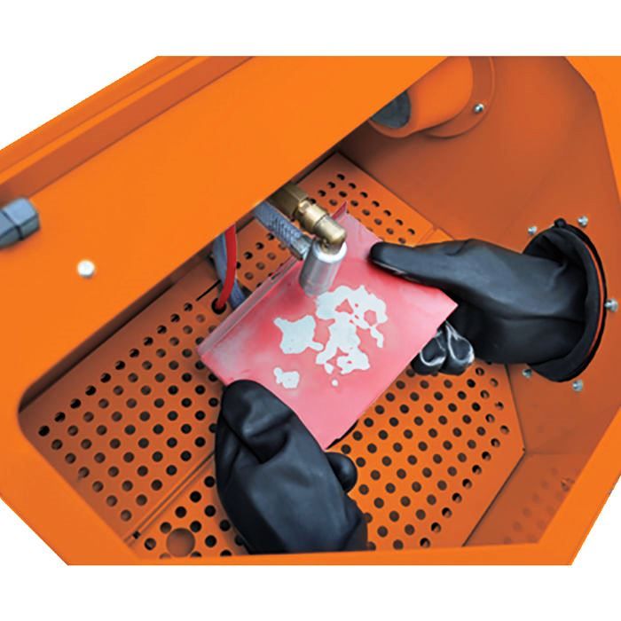 Высококачественные латексные защитные перчатки надежно соединены с корпусом пескоструйной камеры.