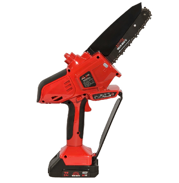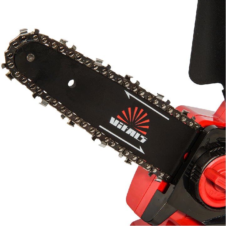 Система бесключевого натяжения цепи – это практичное решение, которое позволяет быстро и точно отрегулировать натяжение цепи без использования дополнительных инструментов. Настройка выполняется вручную за считанные секунды, что дает возможность оперативно поддерживать оптимальное состояние цепи во время работы, значительно упрощает обслуживание инструмента и делает работу с пилой максимально удобной. Система торможения цепи для максимальной защиты пользователя пила оснащена электронным тормозом цепи, который мгновенно останавливает её движение сразу после отпускания кнопки питания. Такое решение минимизирует риск травмирования и повышает общий уровень безопасности во время работы. Кнопка блокировки от случайного включения предотвращает непреднамеренный запуск пилы, что особенно важно при транспортировке или хранении инструмента. Автоматическая система смазывания обеспечивает постоянную подачу оптимального количества масла на цепь и шину. Это снижает трение и нагрев, защищает рабочие элементы от коррозии, снижает износ и значительно продлевает срок их службы, одновременно повышая эффективность резания. Рукоятка с прорезиненным покрытием гарантирует надежный хват, предотвращает скольжение руки и обеспечивает точное и уверенное управление мини-пилой в любых условиях.