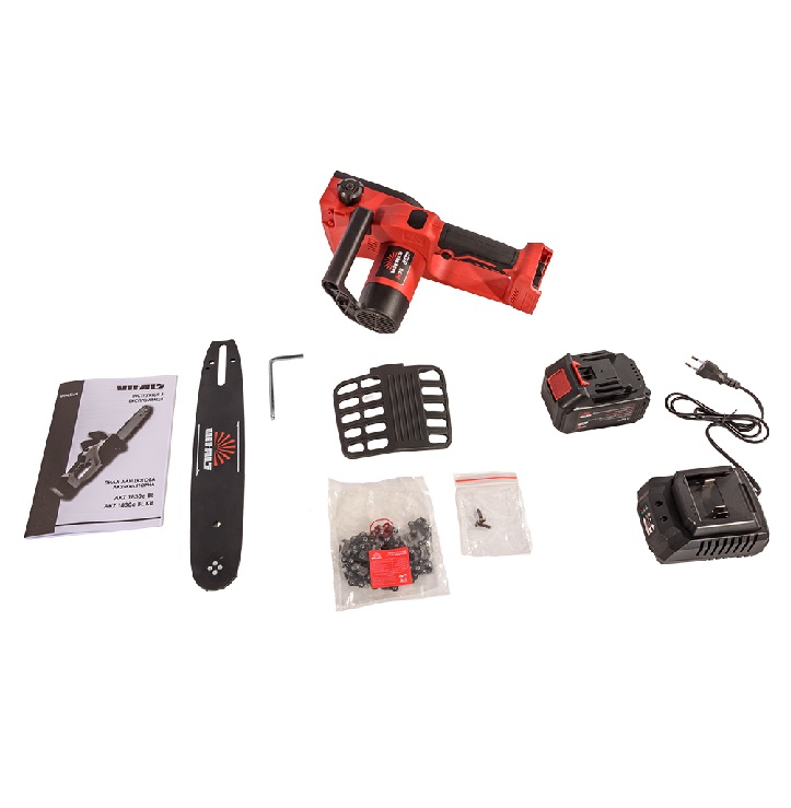Цифровой индикатор степени заряженности батареи даёт возможность пользователю отслеживать уровень заряда подключённой аккумуляторной батареи и планировать работу без непредвиденных остановок. Кнопка блокировки от случайного включения – предотвращает непреднамеренный запуск электропилы. Рукоятка с прорезиненным покрытием обеспечивает удобный хват и точное управление пилой. Аккумуляторные батареи изготовлены по технологии Li-ion, имеют высокий класс энергоэффективности и ресурс более 400 циклов полного «заряда-разряда». Аккумуляторные батареи имеют четыре уровня защиты: от короткого замыкания, перегрева, перезаряда и глубокого разряда. Для отслеживания уровня заряда батареи оснащены светодиодным индикатором. Зарядное устройство – это современное изделие, которое за счёт использования в своей конструкции высокотехнологичных микропроцессоров и алгоритмов автоматически управляет процессом зарядки аккумуляторной батареи, для улучшения её работы и увеличения срока службы.