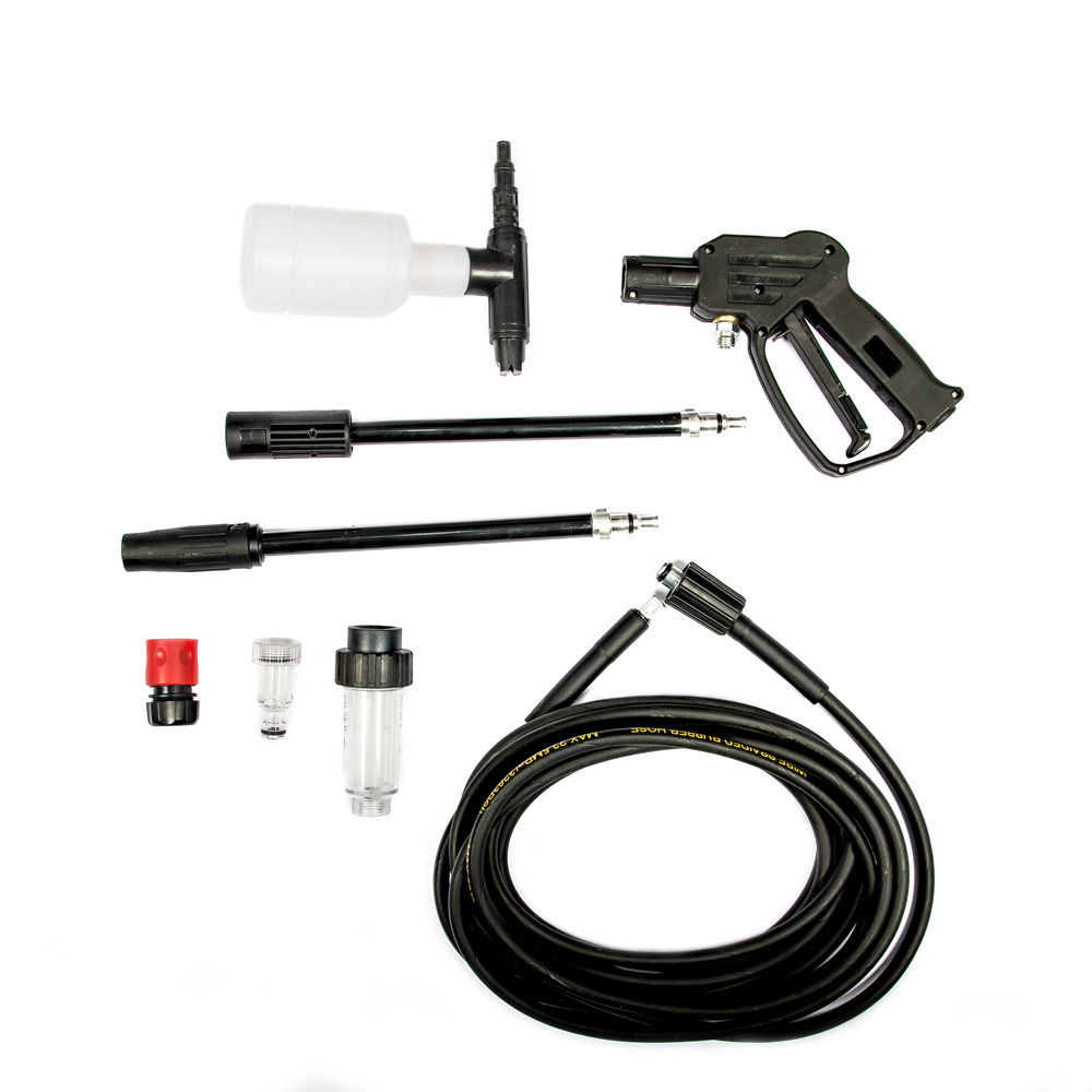 По своей конструкции мойка представляет собой собранные в одном блоке электродвигатель и водяной насос высокого давления, к которому с помощью специального прочного шланга подключен кран-пистолет с форсункой для формирования водяной струи. Ширина водяной струи может регулироваться от узконаправленного потока кинжального типа до широкого веерного распыления. Блок насос-двигатель помещен в прочный пластмассовый корпус, имеющий ручку для переноски. Небольшой вес и малые габариты позволяют с легкостью перемещать минимойку до места ее использования. Длина шланга высокого давления увеличена до 7 метров для удобства мойки больших объектов. А для увеличения прочности, надежности и износостойкости шланг усилен металлической оплеткой. Данная модель имеет в комплекте пенную насадку для жидких моющих средств, которые смешиваются с водой в выбранной пропорции и распыляются на обрабатываемую поверхность.