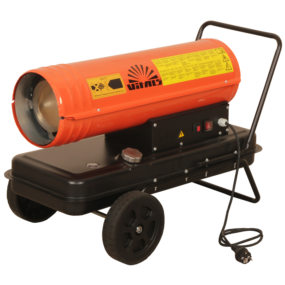 Обогреватель Vitals DH-300 относится к промышленному отопительному оборудованию, работающему на дизельном топливе. Vitals DH-300 с прямым типом нагрева – компактное мобильное устройство, предназначенное для эффективного обогрева производственных и вспомогательных помещений большого объема (строительные объекты, склады, гаражи, торговые павильоны, теплицы, оранжереи и т.д.). Данная модель используется в тех случаях, когда в отапливаемом помещении отсутствуют люди и животные. Модель Vitals DH-300, обладающая тепловой мощностью 30 кВт, способна быстро обогреть помещение площадью до 300 м² (высота потолка не более 3 м). При этом помещение должно быть надлежащим образом утеплено, а также иметь небольшие тепловые потери. Процессы воспламенения и горения топлива, подачи и нагрева воздуха, а также аварийной остановки происходят в автоматическом режиме. Поток нагретого обогревателем воздуха, равномерно распространяющегося по помещению, составляет 720 м³/ч. При работе обогревателя продукты сгорания дизельного топлива выводятся в атмосферу помещения.
