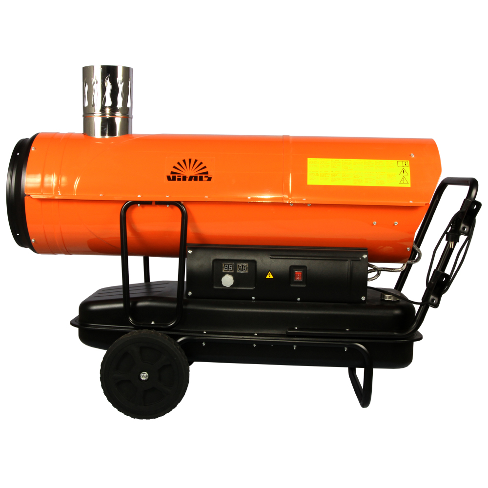 Дизельный обогреватель с непрямым типом нагрева Vitals DHC-801 относится к промышленному отопительному оборудованию, работающему на дизельном топливе. Данная модель незаменима в тех случаях, когда имеется возможность осуществить вывод отработавших газов наружу помещения через специальный газоотвод. Дизельный обогреватель Vitals DHC-801 – компактное мобильное устройство, предназначенное для эффективного обогрева производственных и вспомогательных помещений большого объема (строительные объекты, склады, гаражи, торговые павильоны, теплицы, оранжереи и т.д.). Данное устройство после включения сразу же готово к использованию по назначению и не требуют дополнительного времени на разогрев. Модель Vitals DHC-801, обладающая тепловой мощностью 80 кВт, способна быстро обогреть помещение площадью до 800 м² (высота потолка не более 3 м). При этом помещение должно быть надлежащим образом утеплено, а также иметь небольшие тепловые потери. Отсутствие выброса продуктов сгорания в отапливаемое помещение позволяет использовать эту модель для обогрева помещений, в которых присутствуют люди и животные.