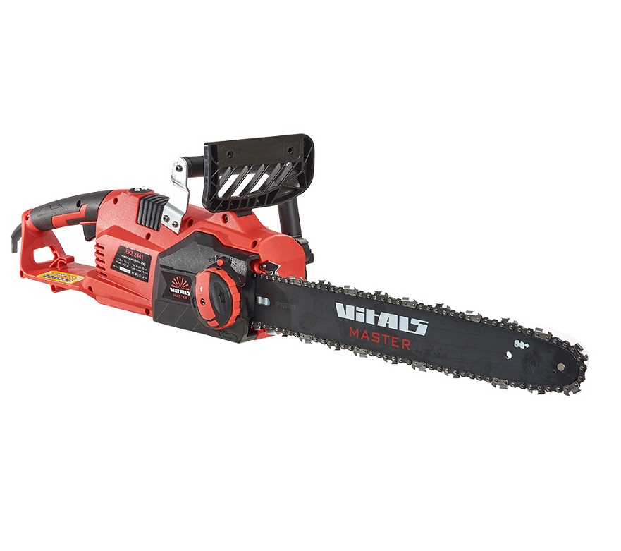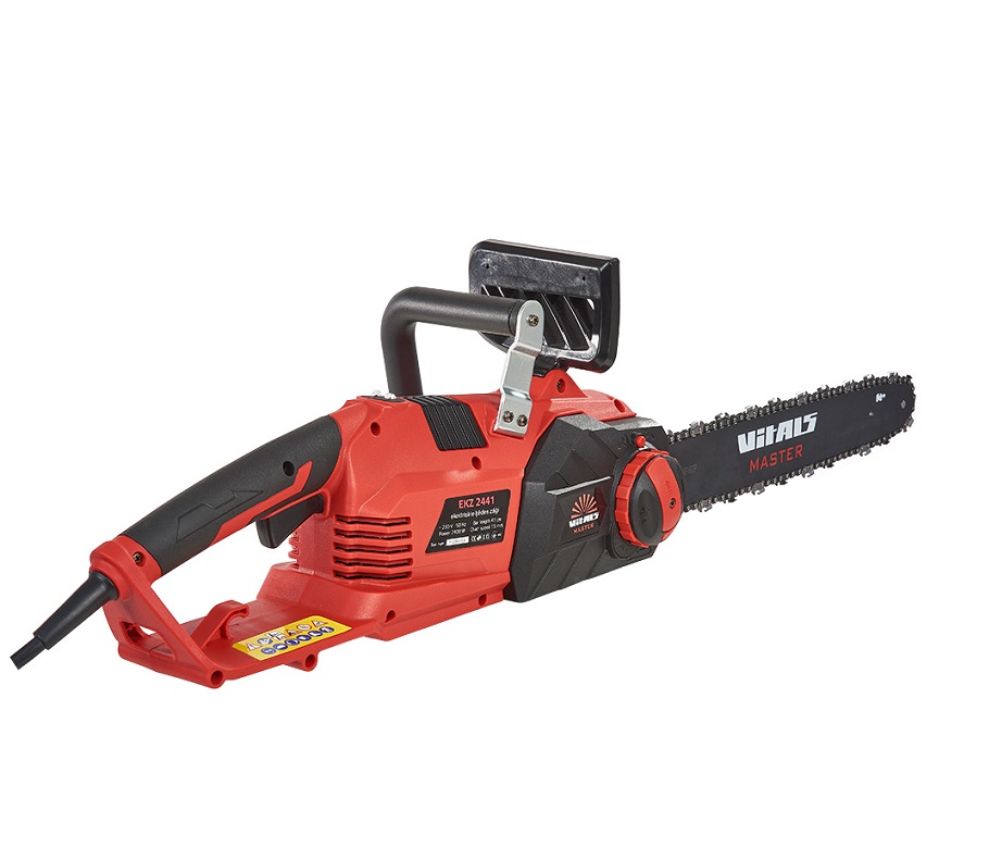Для удобства пользователя применена система бесключевого натяжения цепи. Два индикатора — наличия питания и перегрузки — обеспечат удобную и безопасную работу. Характерная особенность: электропила снабжена высококачественным автоматическим масляным насосом. Для отображения информации об уровне масла предусмотрен указатель. Модель Vitals Master EKZ 2441 имеет продольное расположение электродвигателя, благодаря чему пила в работе намного маневреннее, эргономичнее и удобнее пил с боковым расположением двигателя. Чтобы избежать травм в случае отдачи или «обратного удара», моментально срабатывает аварийный тормоз, блокирующий движение цепи. Время срабатывания тормоза цепи составляет всего 0,12 секунд.