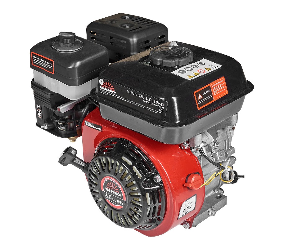Двигатель внутреннего сгорания Vitals GE 6.0-19kp — универсальный бензиновый одноцилиндровый четырехтактный двигатель общего назначения c воздушным охлаждением. Отличительной особенностью модели Vitals GE 6.0-19kp является наличие шкива на два ручья под клиновый ремень профиля B(Б). Двигатель внутреннего сгорания Vitals GE 6.0-19kp мощностью 6,0 л. с. и рабочим объемом 196 см3, может использоваться в составе мини-электростанций, в сельскохозяйственной технике: мотоблоках, мотокультиваторах, косилках, самоходных шасси, ирригационных и оросительных системах, в строительном оборудовании: виброплитах, ударных трамбовках, бетономешалках, компрессорах, насосах и помпах. Крепление двигателя — универсальное. Высокий уровень качества комплектующих, профессиональная сборка и двухуровневая фильтрация воздуха, которая обеспечивается поролоновым фильтром и масляной ванной, гарантируют длительный срок эксплуатации двигателя.
