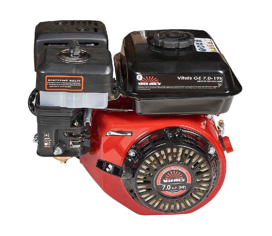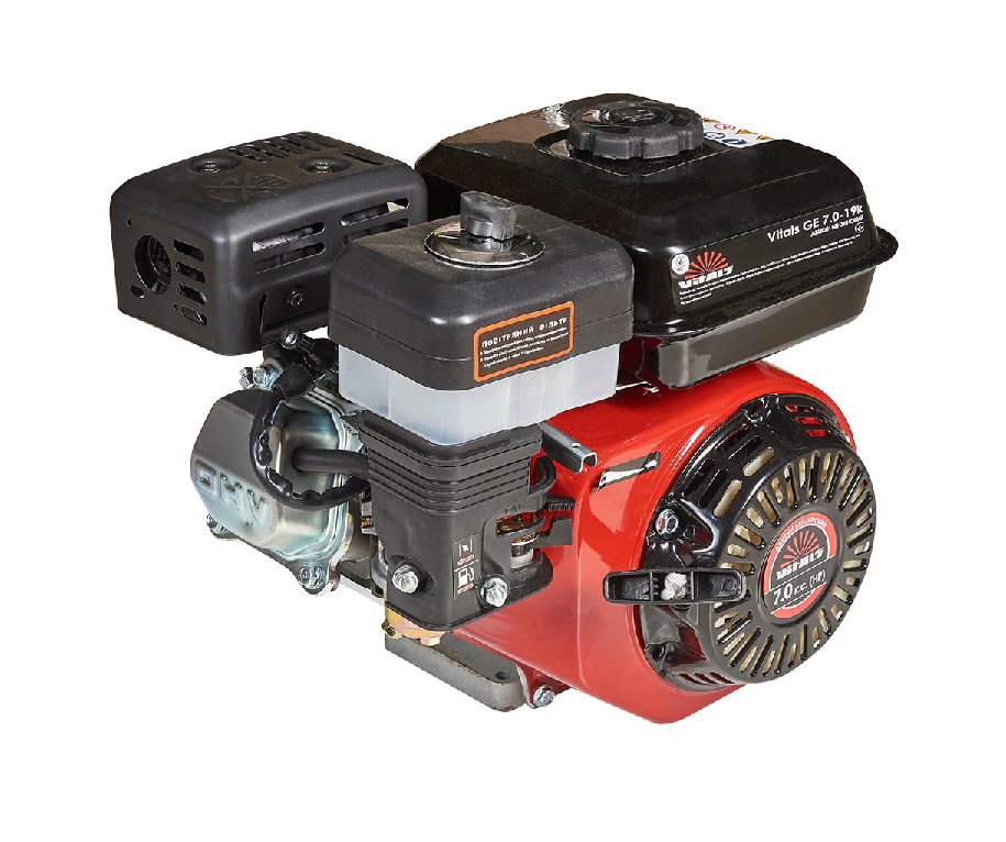 Двигатель внутреннего сгорания Vitals GE 7.0-19k — универсальный бензиновый одноцилиндровый четырехтактный двигатель общего назначения c воздушным охлаждением. Двигатель внутреннего сгорания Vitals GE 7.0-19k мощностью 7,0 л. с. и рабочим объемом 212 см3, может использоваться в составе мини-электростанций, в сельскохозяйственной технике: мотоблоках, мотокультиваторах, косилках, самоходных шасси, ирригационных и оросительных системах, в строительном оборудовании: виброплитах, ударных трамбовках, бетономешалках, компрессорах, насосах и помпах. Крепление двигателя — универсальное. Высокий уровень качества комплектующих, профессиональная сборка и двухуровневая фильтрация воздуха, которая обеспечивается поролоновым фильтром и масляной ванной, гарантируют длительный срок эксплуатации двигателя.