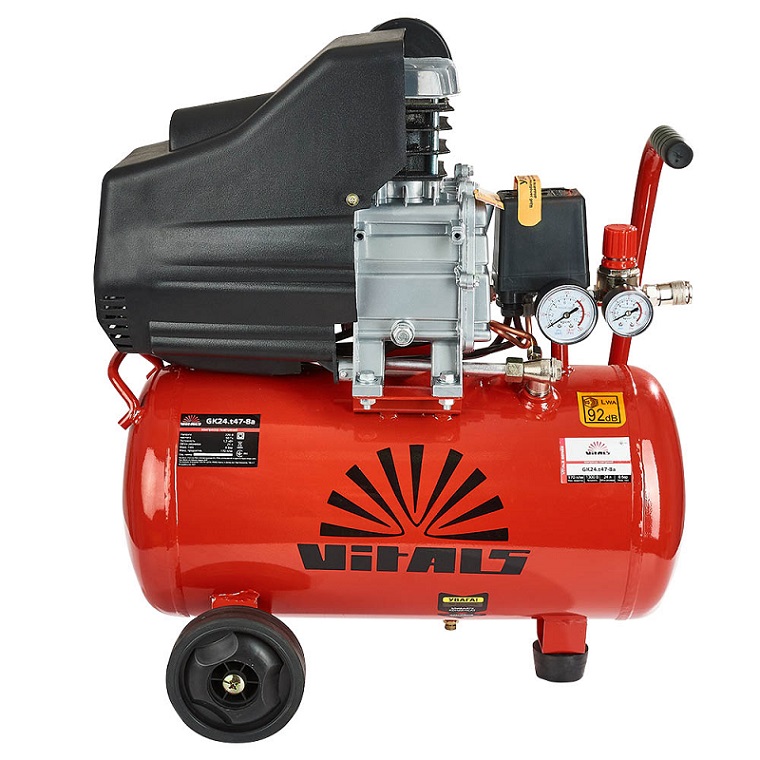 Компрессоры ТМ Vitals отличаются продуманной и надёжной конструкцией, высокой производительностью, оптимальным соотношением цены и качества. Vitals GK24.t47-8a поршневой компрессор c прямым приводом. Аппарат можно отнести к средней по производительности линейке компрессоров Vitals. Электромотор 1.3 кВт обеспечивает производительность поршневой группы 170 л/мин и гарантирует поддержание стабильных оборотов во всём диапазоне рабочих давлений. Vitals GK24.t47-8a с успехом справится со снабжением сжатым воздухом широкого спектра пневмоинструмента, который может понадобиться в быту, в гараже, в небольшой мастерской: продувка, подкачка, мовильница, шарошка, некоторые виды строительного инструмента и прочее.