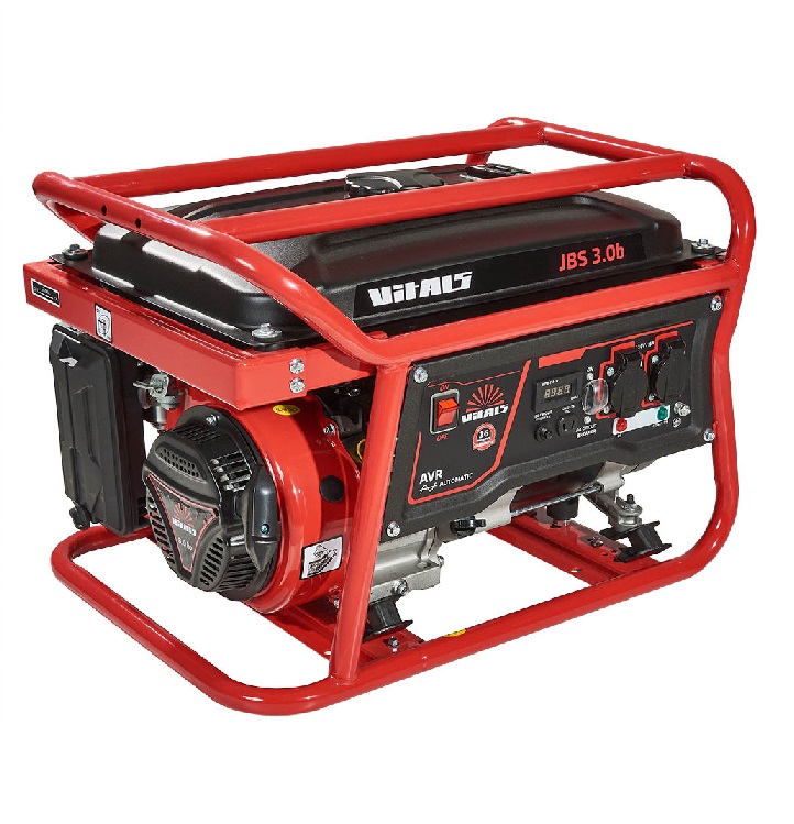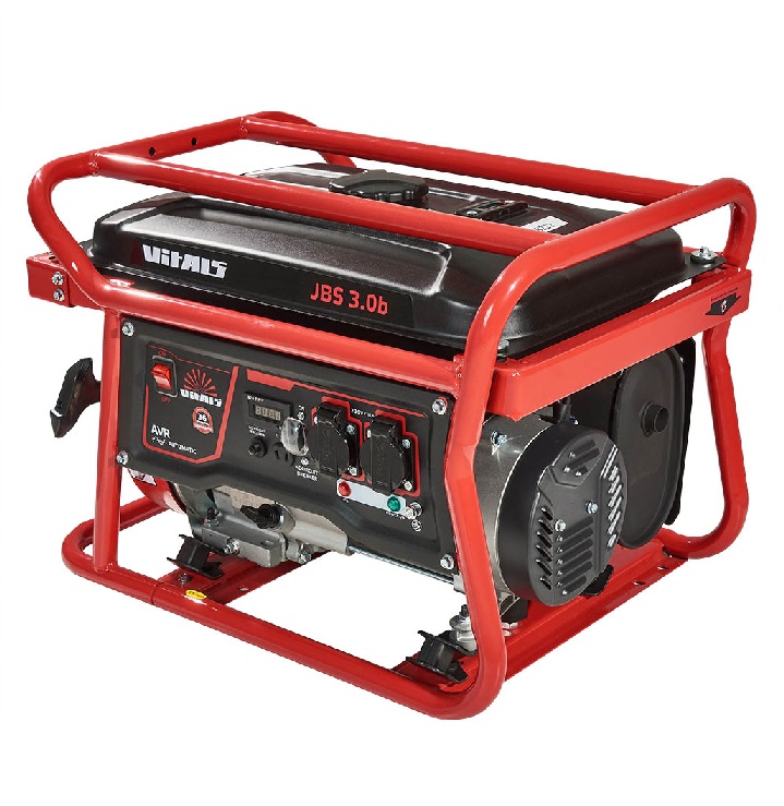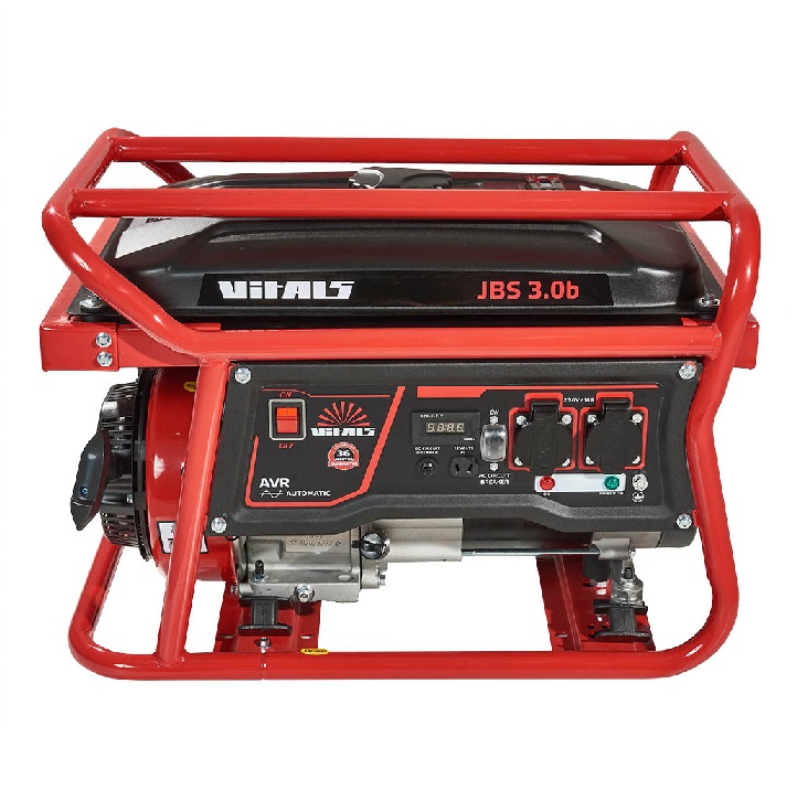Бензиновый генератор Vitals JBS 3.0b – компактная переносная силовая установка, предназначенная для аварийного или резервного электропитания бытовых потребителей однофазного переменного тока напряжением 230 В частотой 50 Гц. Генератор оборудован надежным 4-тактным бензиновым двигателем внутреннего сгорания и высококачественным щеточным синхронным альтернатором, способным вырабатывать переменный электрический ток максимальной мощности 3,0 кВт. Немаловажно, что обмотки ротора и статора генератора - 100% медь! Двигатель и генератор переменного тока установлены на прочной металлической раме (с дополнительной защитой топливного бака) через демпферные опоры, которые существенно снижают вибрацию агрегата и предотвращают его перемещение в процессе эксплуатации. Запуск двигателя осуществляется ручным стартером.