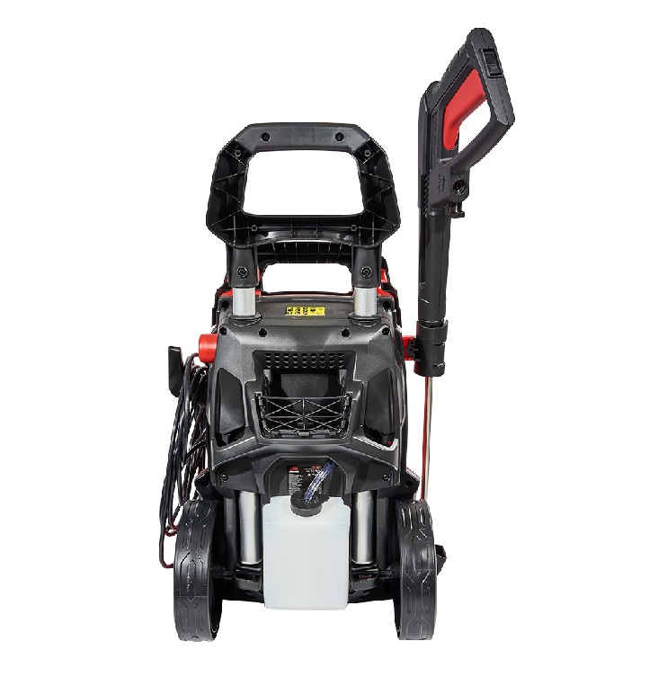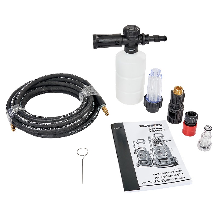 Трехпоршневой осевой насос изготовлен из алюминиевого сплава. Сплав обладает повышенной стойкостью к воздействию абразивных частиц, что увеличивает срок службы мойки. Высокая производительность насоса (7,5 л./мин.) и значительное давление воды на выходе (до 160 бар) способствуют ускорению процесса мойки. Мойка оснащена износостойким шлангом высокого давления. Внутри шланга есть металлическая оплетка, что делает его очень прочным и устойчивым к перегибам и изломам. Длина шланга 7 метров, что позволяет мыть легковой автомобиль со всех сторон, не перемещая мойку. Многофункциональная насадка на пистолет позволяет изменять силу и форму напорной струи и выбрать оптимальный режим для того или иного вида работ. Мойка комплектуется пенной насадкой для создания пены из смеси воды и раствора для бесконтактной мойки. На пенной насадке установлен регулятор для формирования густой пены и в то же время для максимально эффективного использования моющего средства. Для защиты помпы от попадания абразивных частиц, в комплекте есть два фильтра тонкой очистки воды. Второй дополнительный фильтр обычно используют при подключении к открытым источникам воды. Насос является самовсасывающим. Это позволяет использовать для водоснабжения мойки открытые источники — бочки, баки и т.д. При прекращении подачи воды в пистолете срабатывает механизм автоматической остановки двигателя. Он помогает уберечь насос от перегрева и быстрого износа.