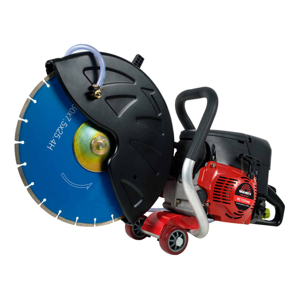 В качестве режущего инструмента используется диск с алмазным напылением диаметром 350 мм. Максимальная глубина реза составляет 110 мм. Чтобы линия реза была ровной, используются направляющие ролики. Максимальная скорость вращения диска довольно-таки высокая – 5100 об/мин, что очень важно при резке прочного по своей структуре материала. Для охлаждения режущего диска, в процессе работы изделия используется водяная система. На бензорезе Vitals Master BG 7235wp используется многоуровневая система фильтрации: основной фильтр – бумажный, вспомогательный – поролоновый.