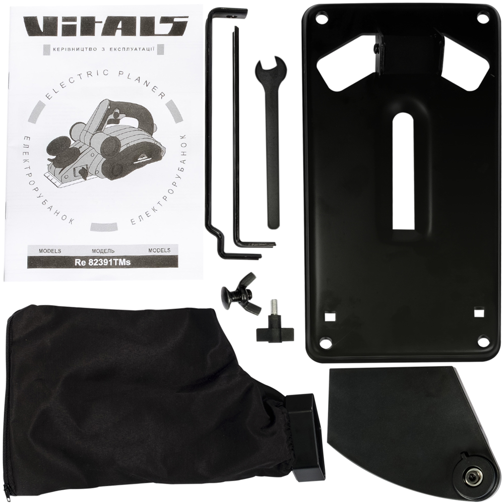 В комплект электрорубанка входят параллельная направляющая и направляющая для строгания шпунта. Они легко и быстро крепятся на корпусе рубанка с помощью винтовых зажимов и значительно расширяют функциональные возможности инструмента за счет обеспечения точности параллельных проходов и автоматического выдерживания всех геометрических параметров процесса строгания. Кроме того в комплекте имеется специальный профессиональный стенд для закрепления электрорубанка в перевернутом положении. Рубанок устанавливается в стенд и закрепляется с помощью винтовых зажимов, превращаясь в стационарный столярный инструмент. Клавиша включения имеет кнопку фиксации во включенном положении. Для сбора стружки и пыли имеется специальный мешок, также можно подключать через адаптер шланг пылесоса, причем отвод отходов можно осуществлять как на правую, так и на левую стороны электрорубанка. Источником энергии для электрического рубанка Vitals Professional Re 82391TMs служит однофазная сеть переменного тока с напряжением 220-230 В и частотой 50 Гц. Также можно подключать этот инструмент к передвижной миниэлектростанции (генератору) переменного тока мощностью от 2,0 кВт и более.