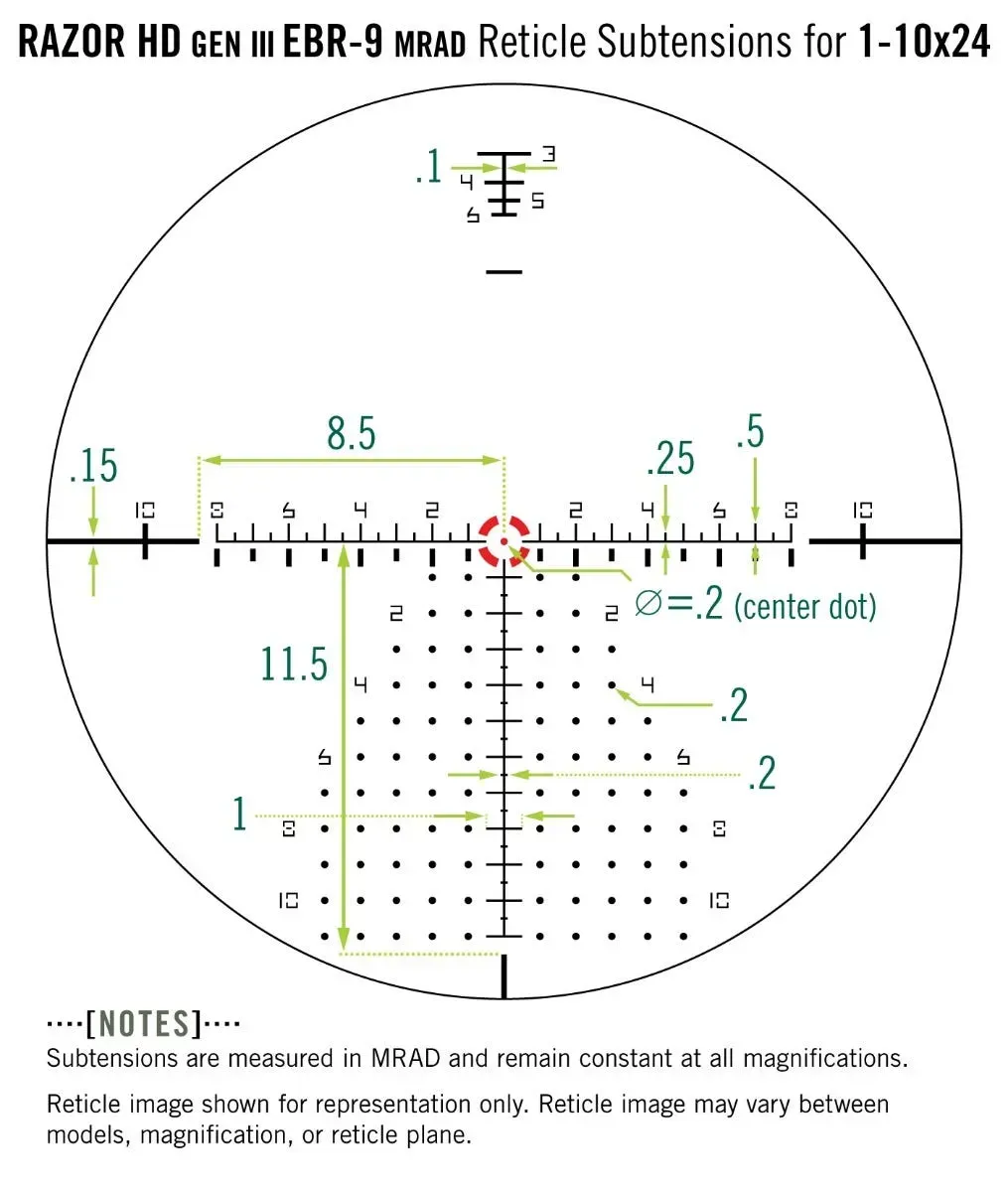 Приціл третьої генерації - Vortex Razor HD Gen III 1-10x24 FFP EBR-9 (MRAD) (RZR-11002). Тактичний приціл з 10-кратним збільшенням, з сіткою у першій фокальній площині. Преміум компоненти, використані в механізмах трансфокатора та внесення поправок, роблять процес зміни збільшення плавним, а процес внесення поправок чітким, підвищуючи довговічність механізмів загалом. Такі особливості, як низкодисперсне XD-скло об'єктива, фірмове просвітлення XR, захисне покриття оптики ArmoTek, повний водозахист, заповнення аргоном, і монолітний 34-мм алюмінієвий корпус дозволяють прицілу Vortex Razor HD Gen III 1-10x24 FFP EBR-9 (MR RZR-11002) не тільки задовольнити, але й значно перевершити усі очікування його щасливого власника.