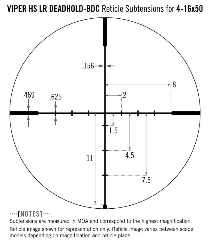 Универсальная прицельная сетка Dead-Hold BDC позволяет быстро определить траекторию падения пули на различных дистанциях и принять необходимые поправки по вертикали и горизонтали.