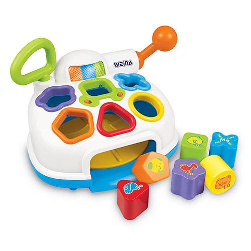 Сортер Weina обучает цветам и фигурам, вставьте правильную фигуру в сортер и зазвучит музыка. В наборе 6 блоков разной формы и цвета. Для тго чтобы достать фигуры необходимо потянуть за рычаг. У игрушки 2 режима звука. Световые эффекты. Сортер поможет развивать координацию движений, моторику рук.