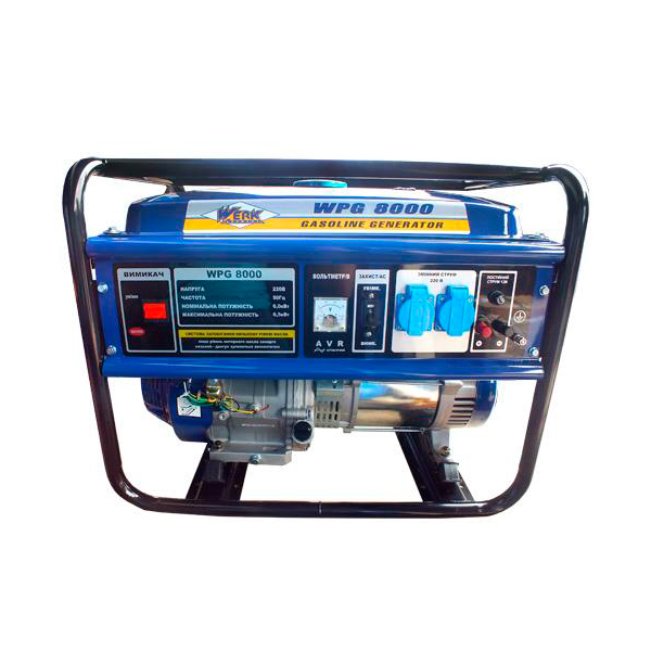 WERK WPG 8000 - надежный и качественный бензиновый генератор, в стабильной работе которого смогут убедиться владельцы частных домов, дач, а также небольших помещений, где требуется источник тепла, в случае отсутствия возможности подключения к основной линии электропитания. WERK WPG 8000 имеет целый ряд достоинств - это и мощный четырехтактный одноцилиндровый бензиновый двигатель с экономным расходом топлива и длительный срок автономной работы, а также весьма низкий уровень вибрации и шума. Запуск прибора происходит с помощью ручного стартера, который не подведет при любых условиях эксплуатации. Он настолько прост и удобен в управлении и обслуживании, что потребует минимум вашего участия, а хорошая защита и продуманная конструкция позаботятся о долгом сроке службы WERK WPG 8000 без поломок.
