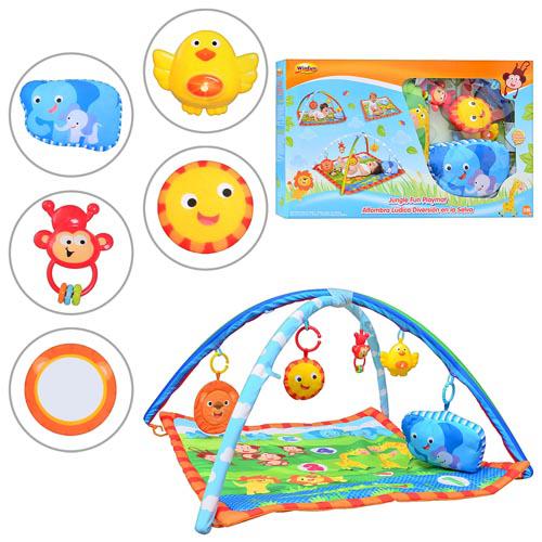 В комплекте Развивающего коврика WinFun 0831 NL5 мобильных подвесных игрушек: солнышко из плюшевой ткани со звуком, обезьянка с цветными подвижными колечками, птичка с мигающим светом, издающая звуки и музыку, лев с зеркальцем, мягкая подушка с изображением слоников.