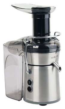 Коментарий: Не шумит громко, большая горловина для загрузки, есть щеточка для очистки ситечка, корпус из нержав. стали, наличие системы очистки кнопкой "Турбо" и 2х скоростей, есть перегородка для фильтрации пены в стакане для сбора сока, а также линейка, сразу видно, какое количество сока получилось. По столу не "танцует". Недостатки: долго моется (минут 10). Короткий шнур. Трудно собирать и разбирать. Толкатель не всегда до конца проталкивает кусочки овощей/фруктов. Кнопка скоростей работает таким образом, что можно нечаянно перевести на др. скорость. Жмых относительно сухой и мелкий, можно использовать в др. целях или замораживать. Из 1 кг очищенных от внутренностей яблок вышло 520 мл сока, из 600 гр морковки получилось 350 мл сока. Перемалывает очень быстро.