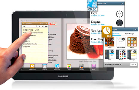 Предустановленных программ немало и вполне достаточно для полноценной работы с устройством. Здесь множество сервисов Google, включая почту, поиск и навигацию, быстрые заметки Pen memo, календарь, Polaris Office для работы с файлами Word, Excel и презентациями PowerPoint, графический редактор, программа чтения электронных книг и др. программы. Естественно, планшет позволяет устанавливать понравившиеся приложения с Android Market. А еще к услугам владельца Samsung Galaxy Tab 10.1 - онлайн-магазина Samsung Apps. Ярлыки для доступа к обеим онлайн-источникам приложений помещены на главный рабочий экран, что сильно облегчит жизнь не слишком искушенным в технологиях владельцам планшета. Остается добавить, что практически все Android-приложения для смартфонов без проблем запускаются и на планшете. При этом грузятся и работают программы очень шустро – мы не нашли ни одной программы, которая бы заставила планшет «тормозить». Даже HD видео планшет проигрывает как заправский медиа-плеер, плавно и без рывков.