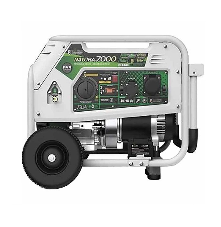 Генератор бензин - газ GENERGY NATURA 7000 7 / 6 кВт – однофазна 230 В газово-бензинова електростанція для забезпечення електроенергією потужних побутових електроприладів, будівельного інструменту тощо. Модель може використовуватися у якості основного або резервного джерела живлення. Максимальна потужність генератора – 7 кВт при використанні палива – бензин та 6 кВт при використанні палива – пропан. Номінальна потужність (максимально допустима потужність для тривалих навантажень) – 6 кВт бензин та 5,5 кВт пропан.