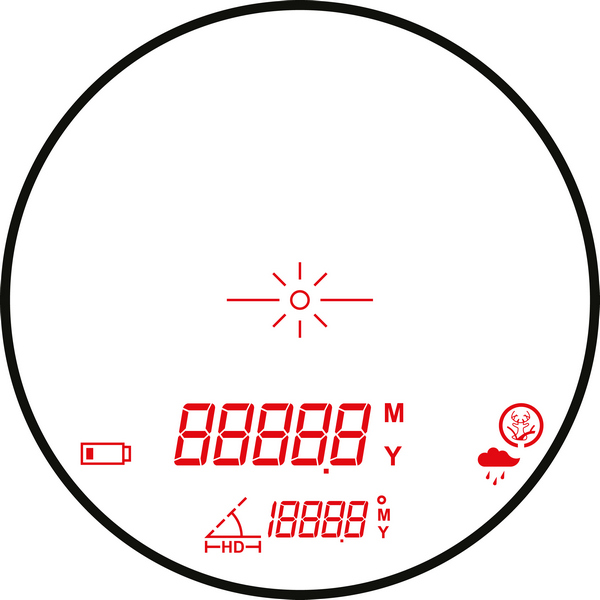 HUNT - для измерения реальной дистанции до объекта в пространстве во время охоты, без учета уклона. Игнорирование интерференции, возникающей при прохождении лазерного луча через траву и мелкие кусты. Этот режим полезен для замера дистанции до достаточно крупных целей, как к примеру олень, перемещающийся среди кустов, деревьев и травы. В этом режиме отображается пиктограмма оленя в кружке.
