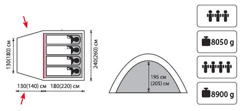 - Тент: 100% полиэстер 75D/190T WR PU, 3000 мм в ст - Внутр. палатка: 100% дышащий полиэстер - Дно: ламинированный полиэтилен - Каркас: фиберглас - Вес 8,9 кг