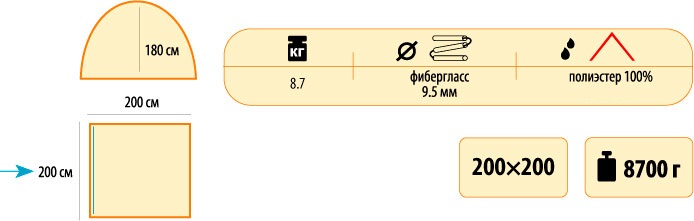 - Тент: 100% полиэстер 2000 мм в ст. - Каркас: фиберглас - Размеры: 200x200x180 - Вес: 4,4 кг